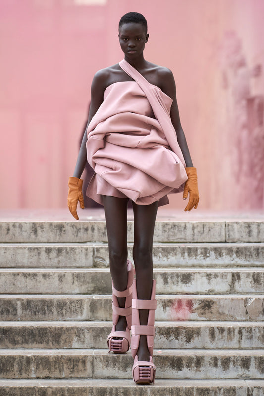RICK OWENS SS2024 PINK LEATHER DRAPED BUSTIER MINI DRESS