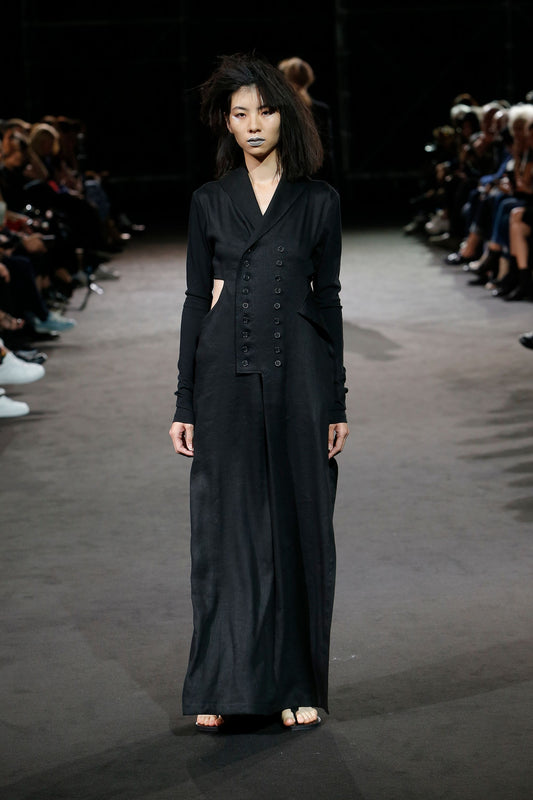 YOHJI YAMAMOTO SS2019 BLACK LINEN DOUBLE BREASTED CUT OUT MAXI DRESS