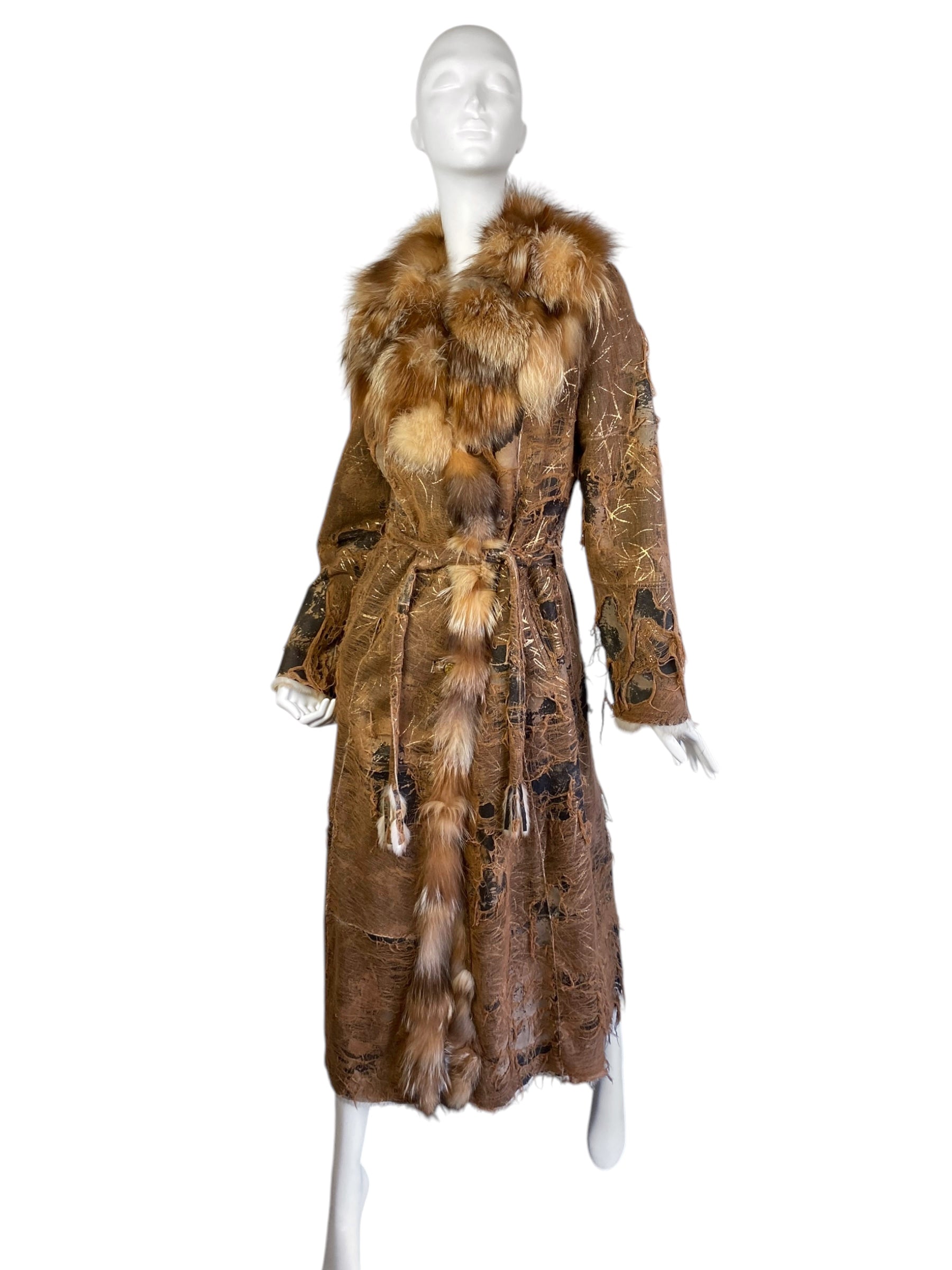 AMORETTI 2000s BROWN FOX FUR & GOLD LEAVES DISTRESSED COAT