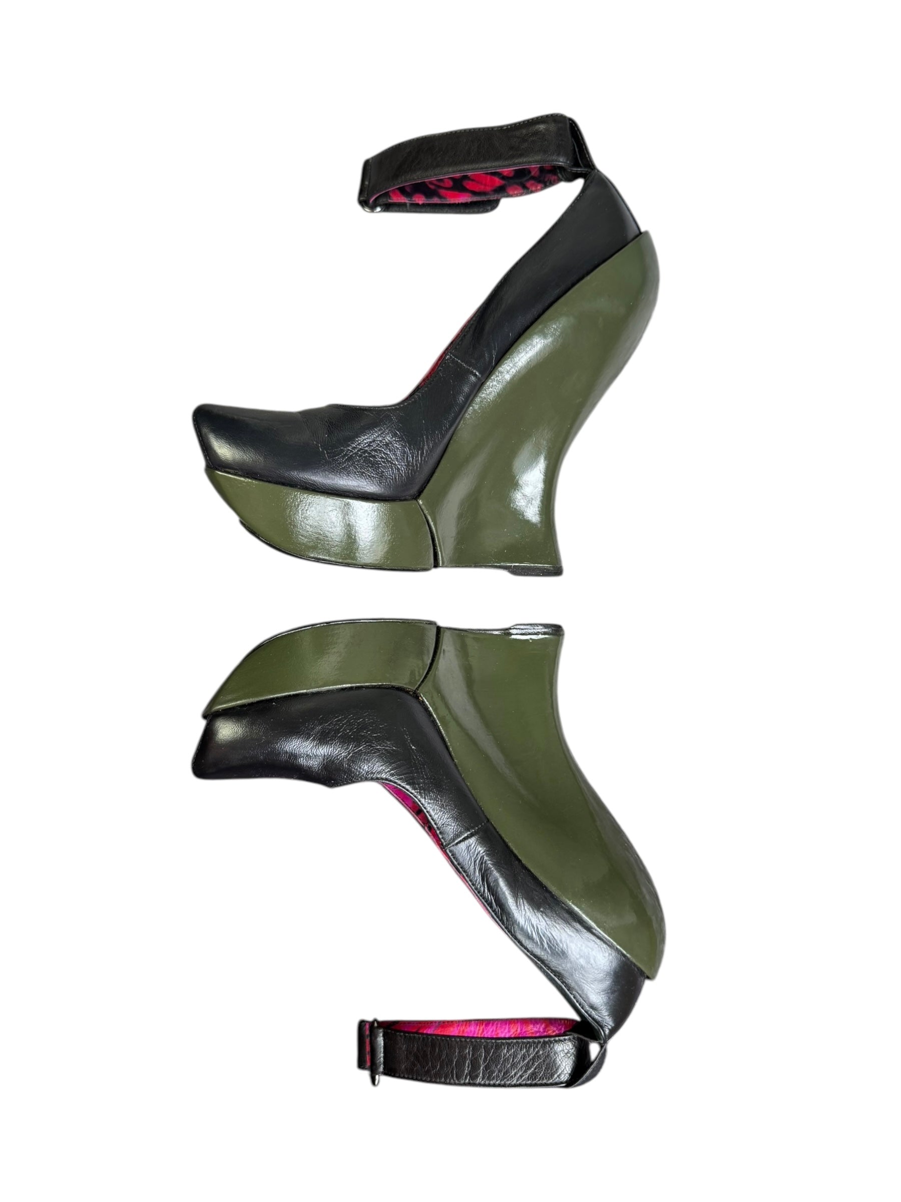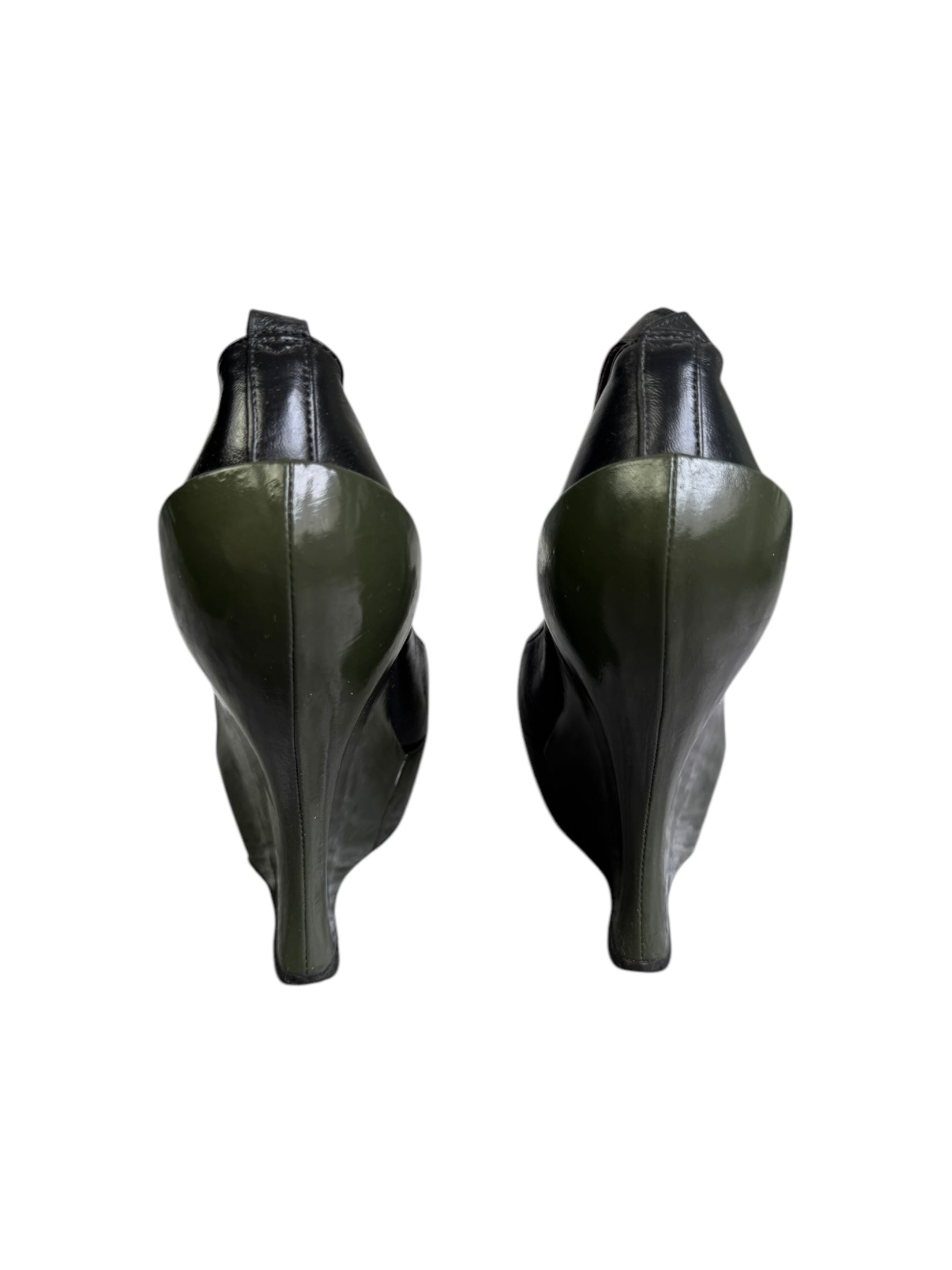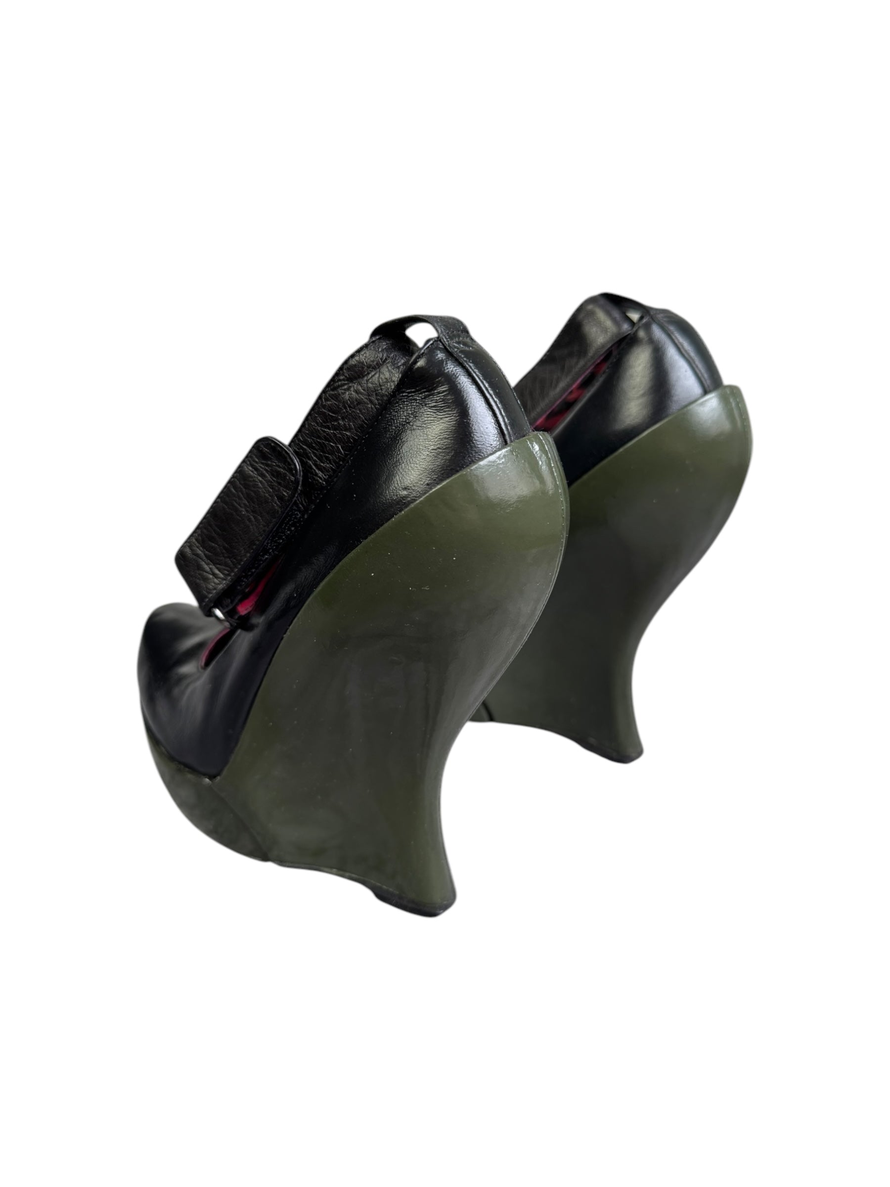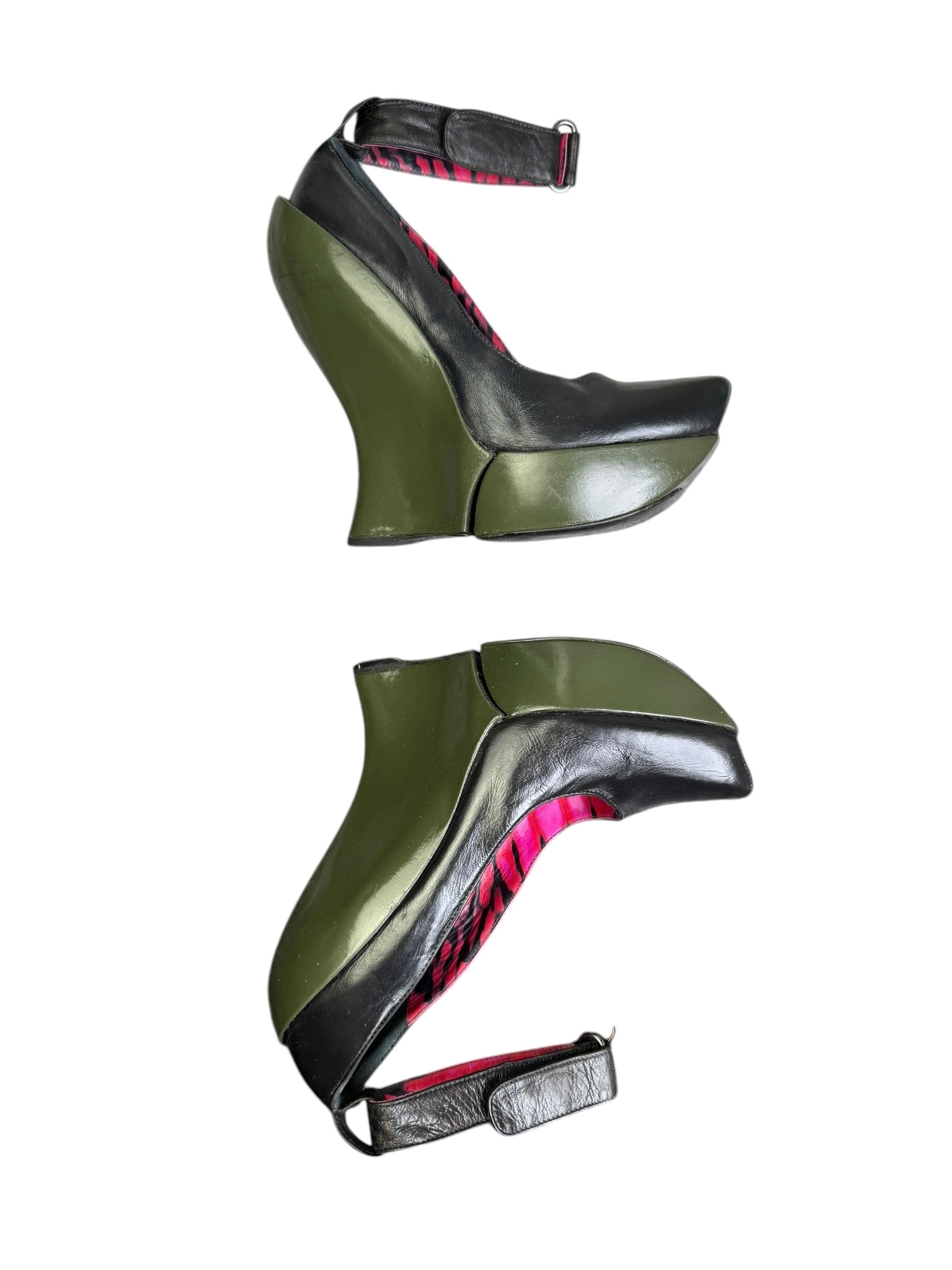 CELINE FW2008 BY IVANA OMAZIC BLACK & GREEN LEATHER ANKLE STRAP WEDGE PLATFORM HEELS