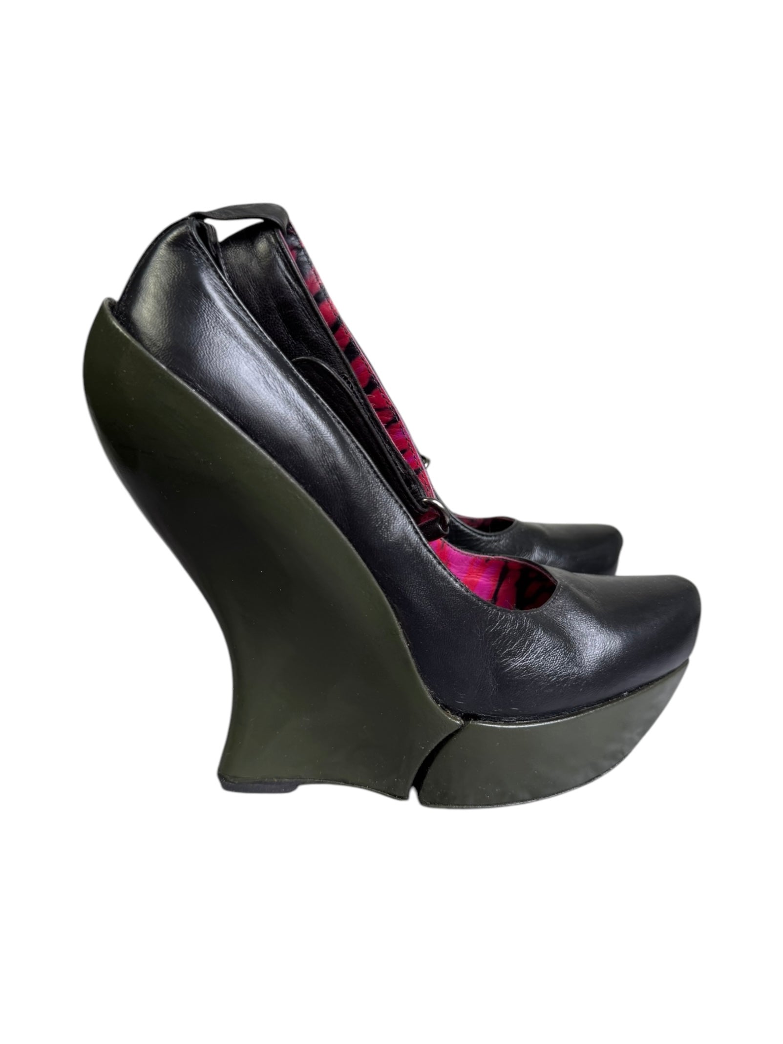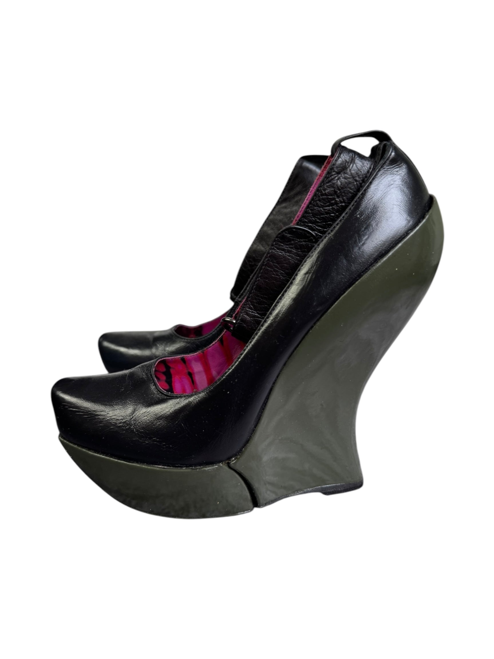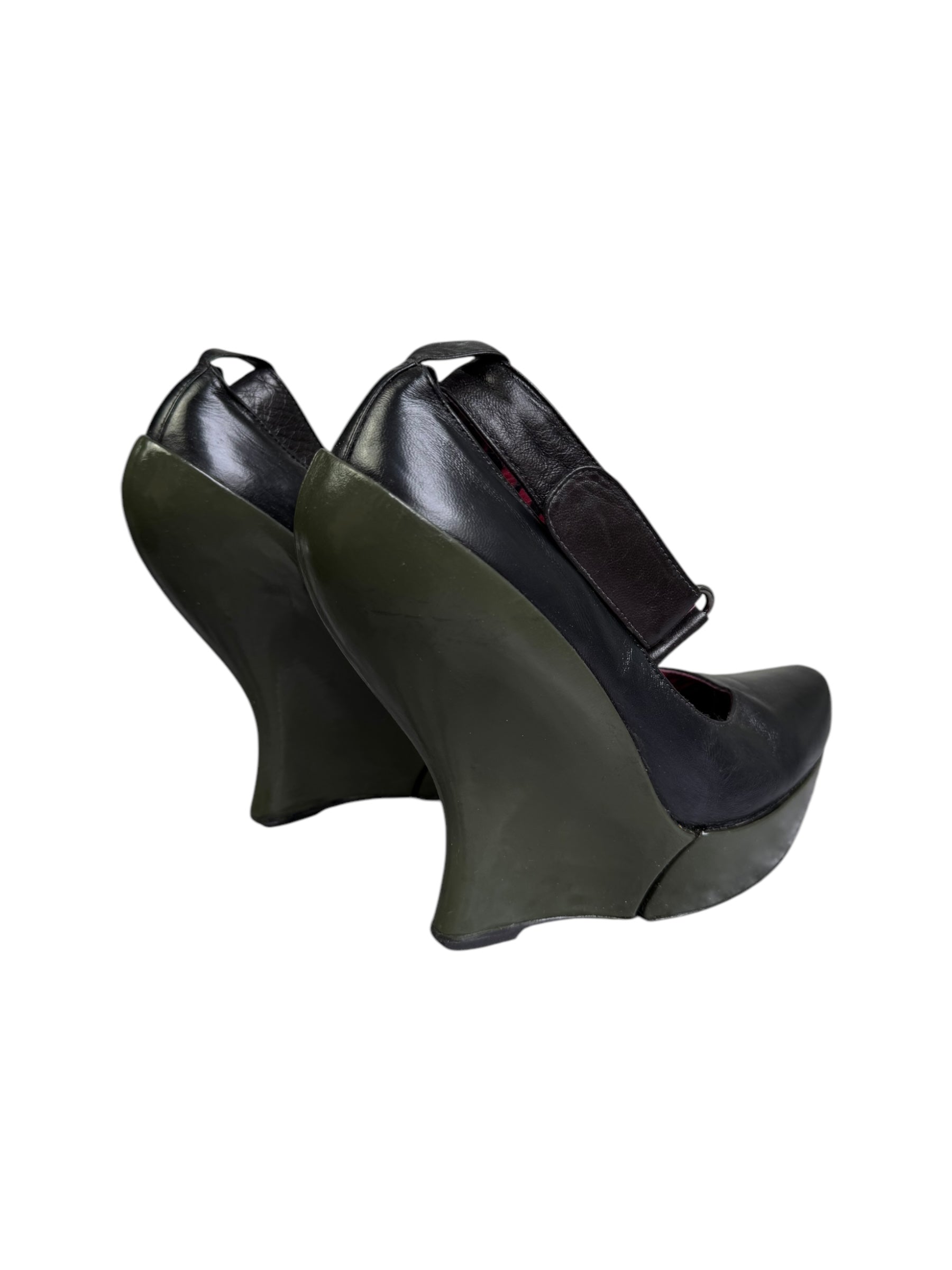 CELINE FW2008 BY IVANA OMAZIC BLACK & GREEN LEATHER ANKLE STRAP WEDGE PLATFORM HEELS