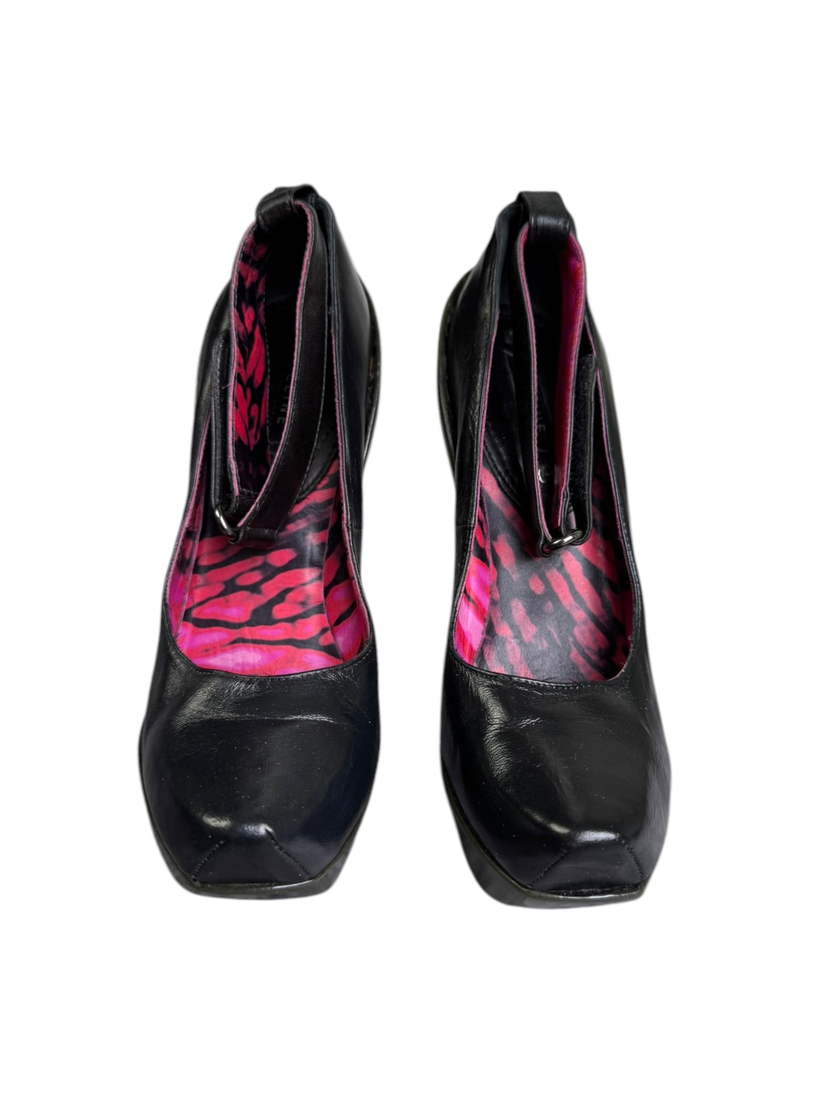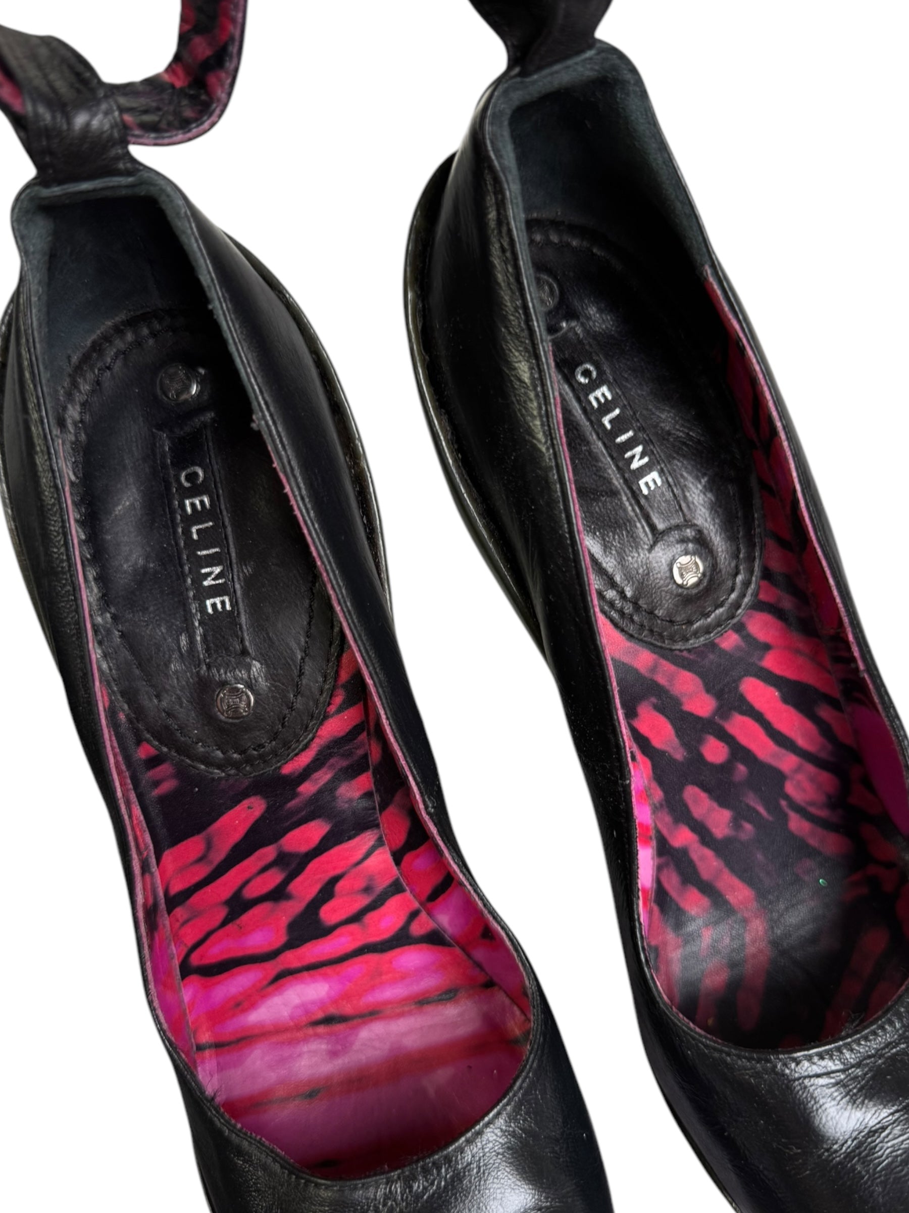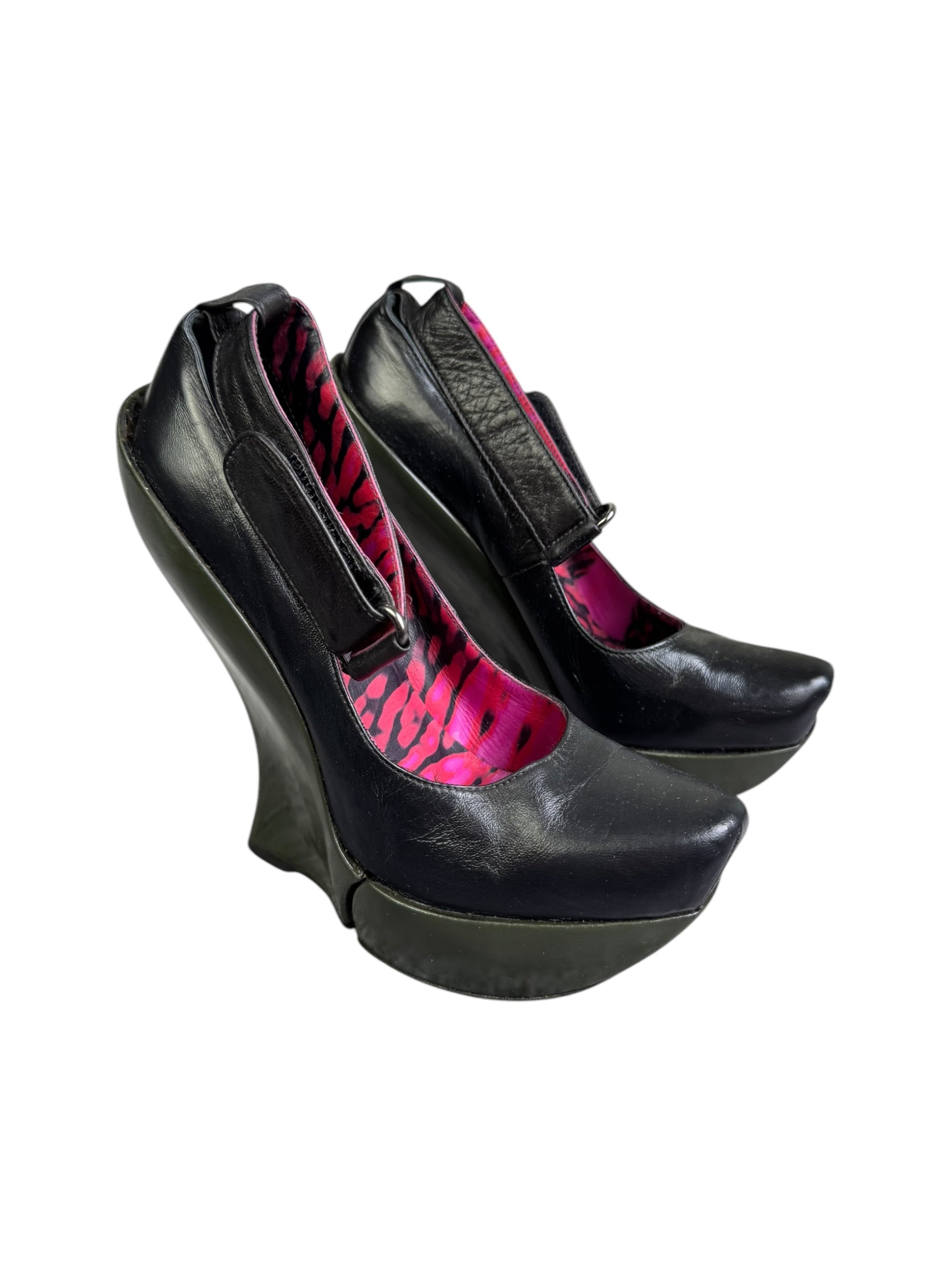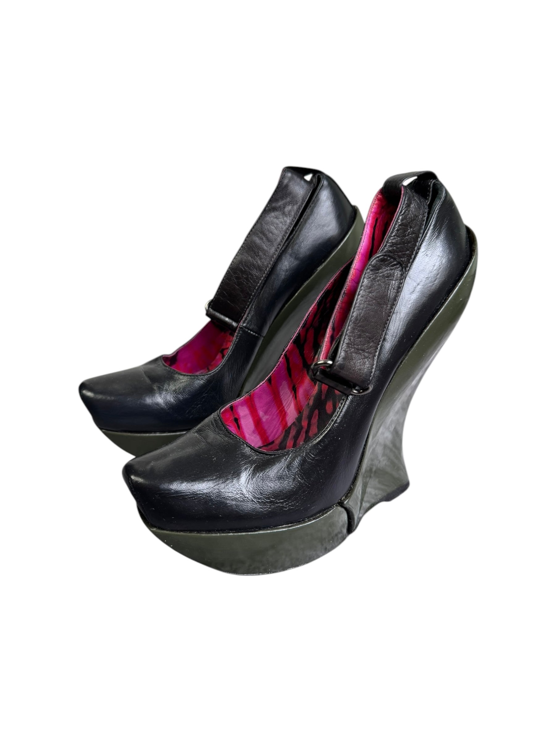 CELINE FW2008 BY IVANA OMAZIC BLACK & GREEN LEATHER ANKLE STRAP WEDGE PLATFORM HEELS
