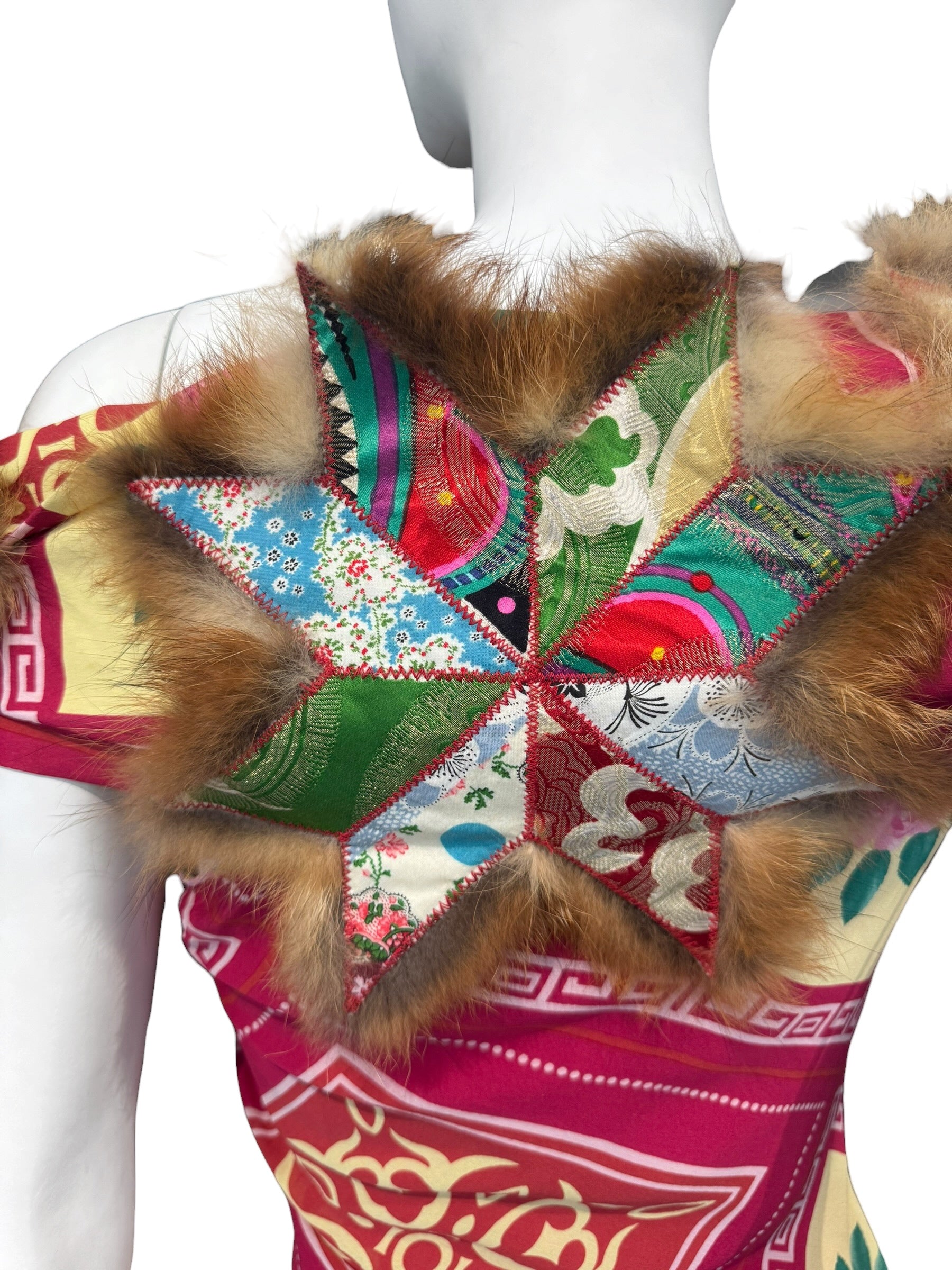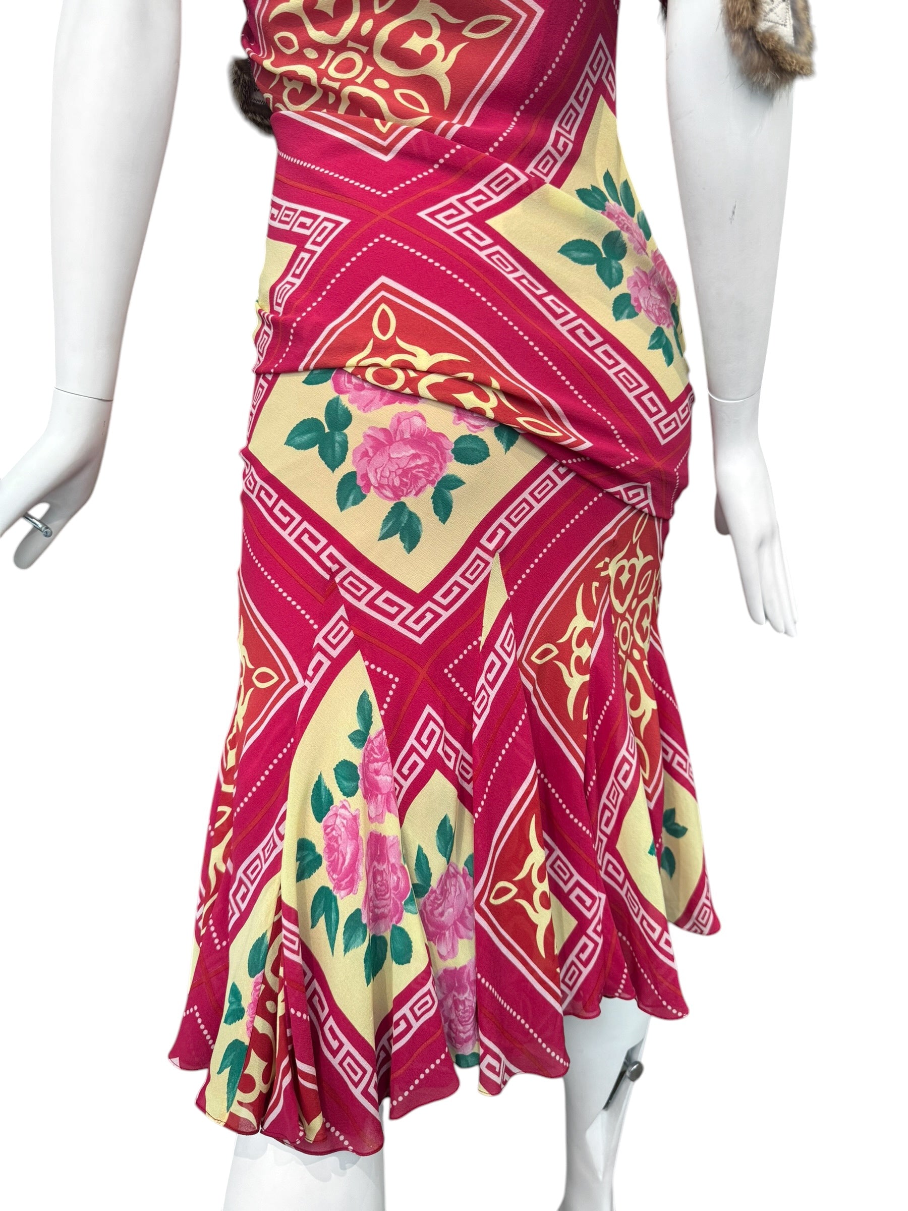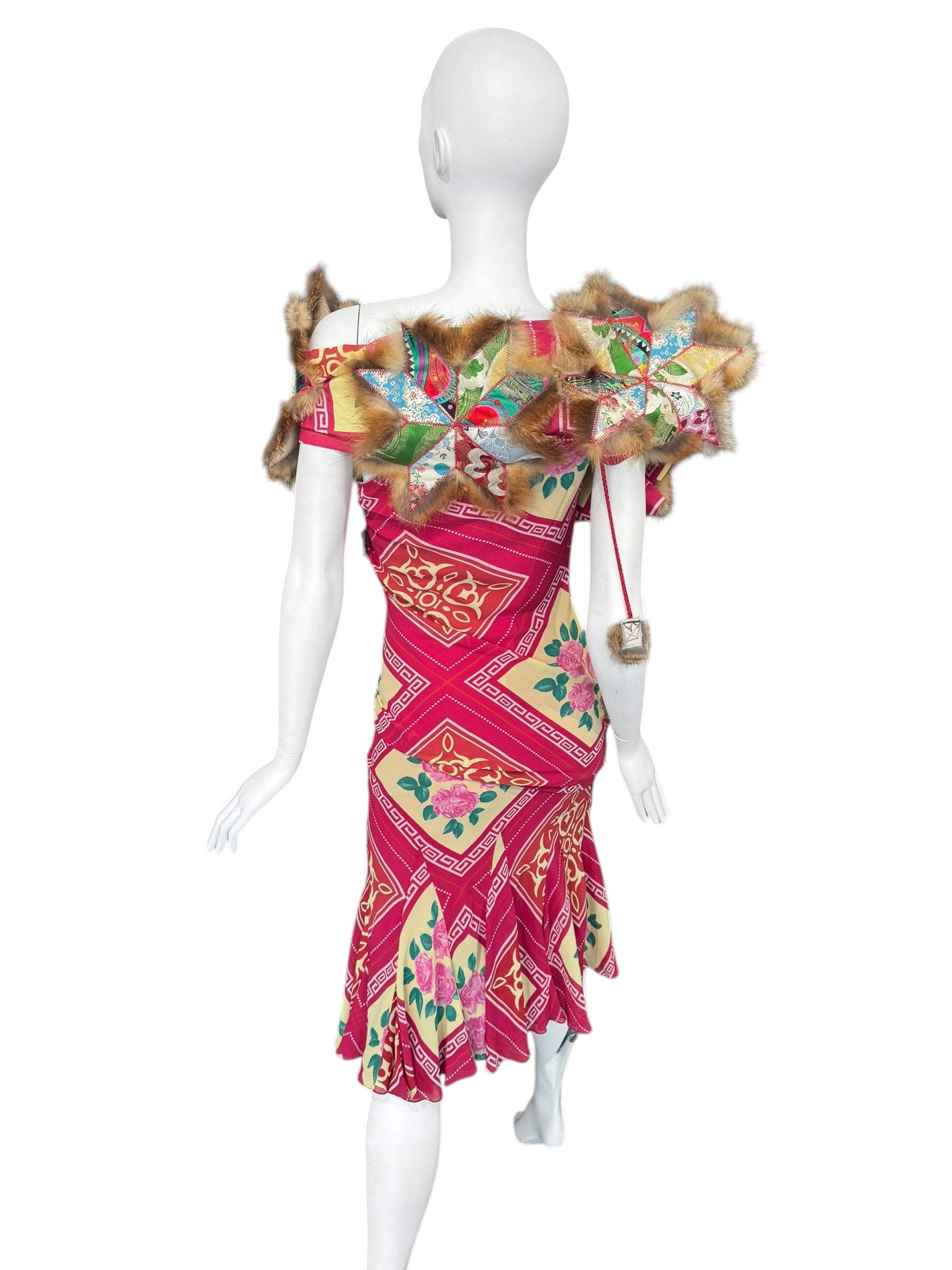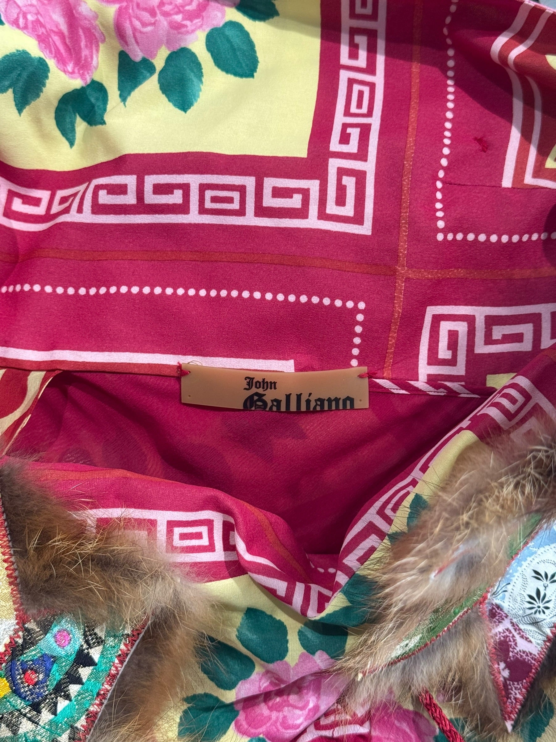 JOHN GALLIANO FW2002 PINK SILK & FUR FOLKLORIC FLORAL PRINT MIDI DRESS