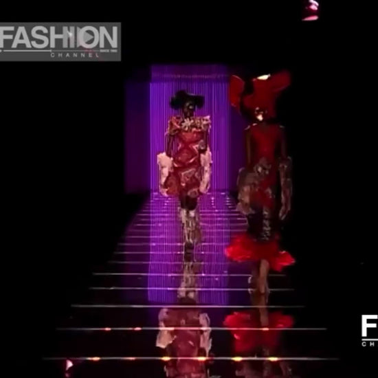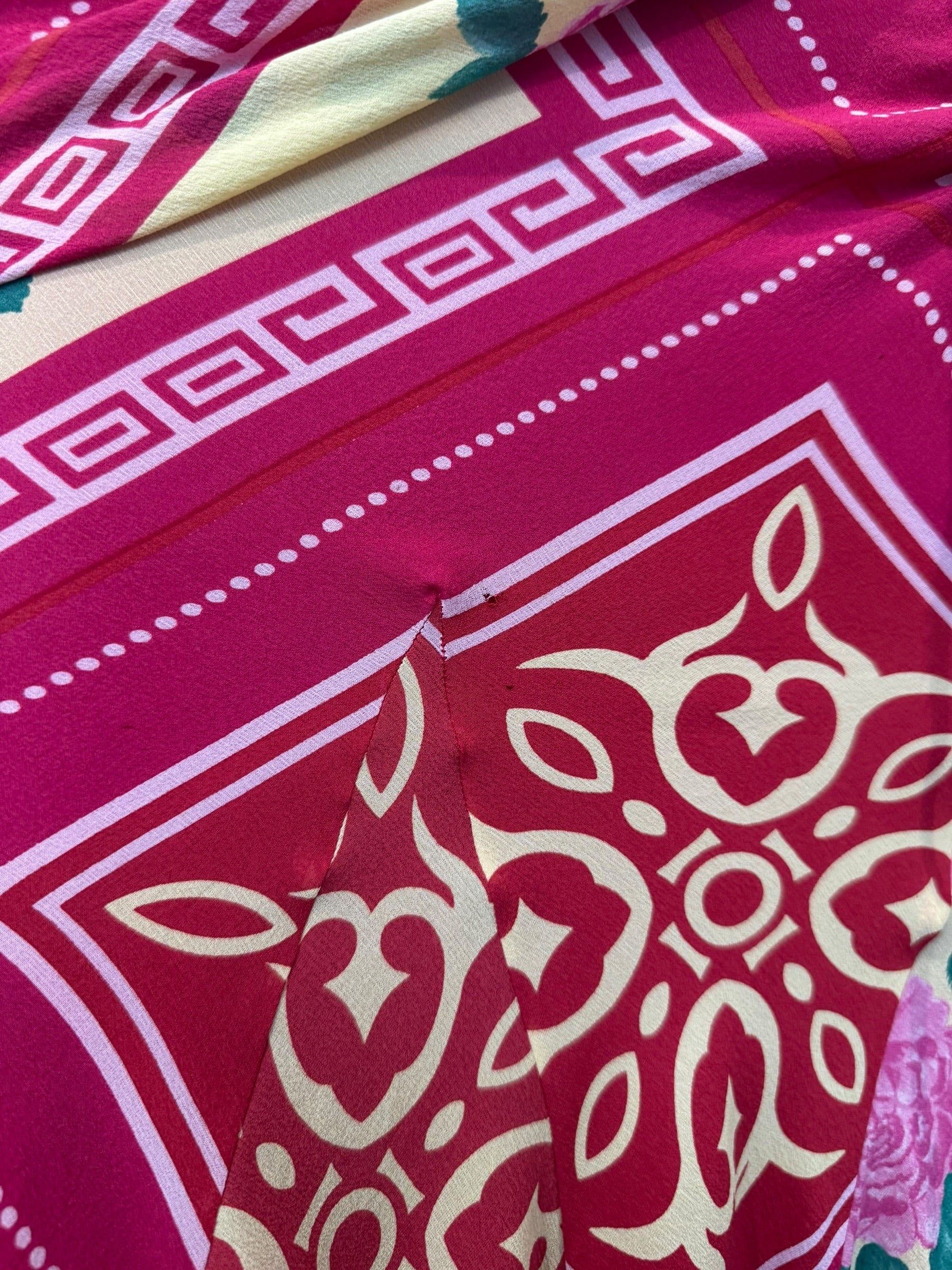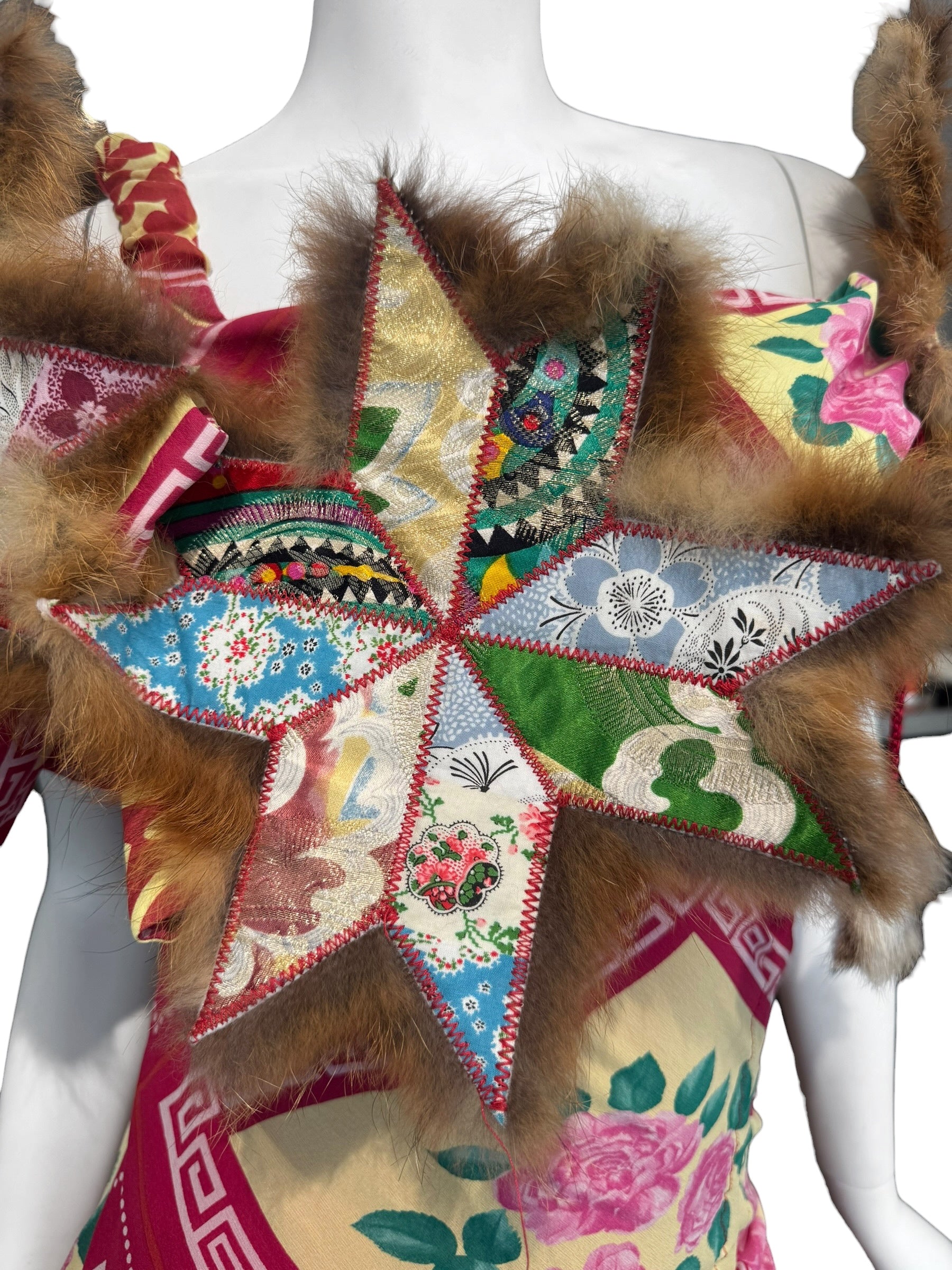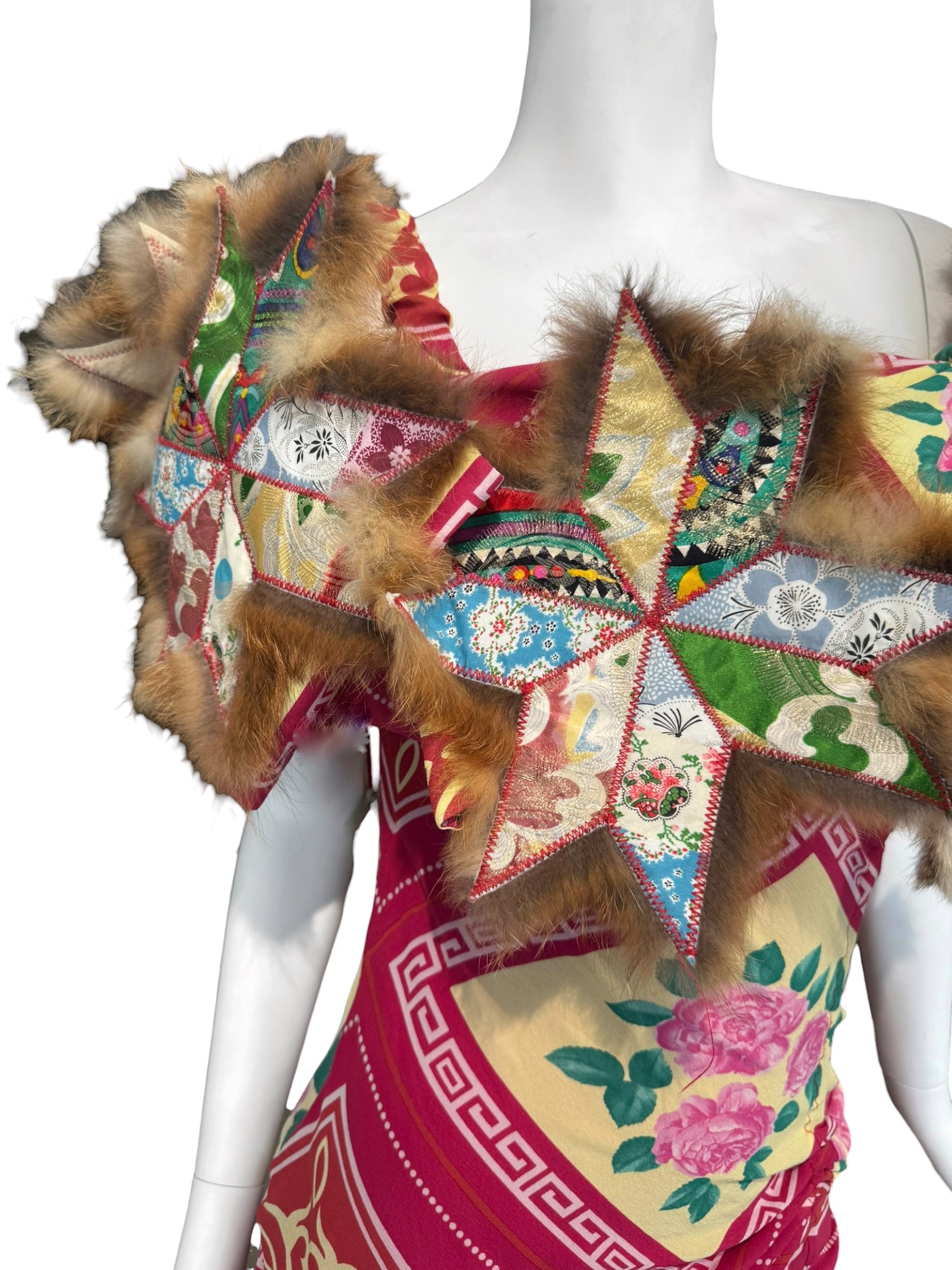 JOHN GALLIANO FW2002 PINK SILK & FUR FOLKLORIC FLORAL PRINT MIDI DRESS