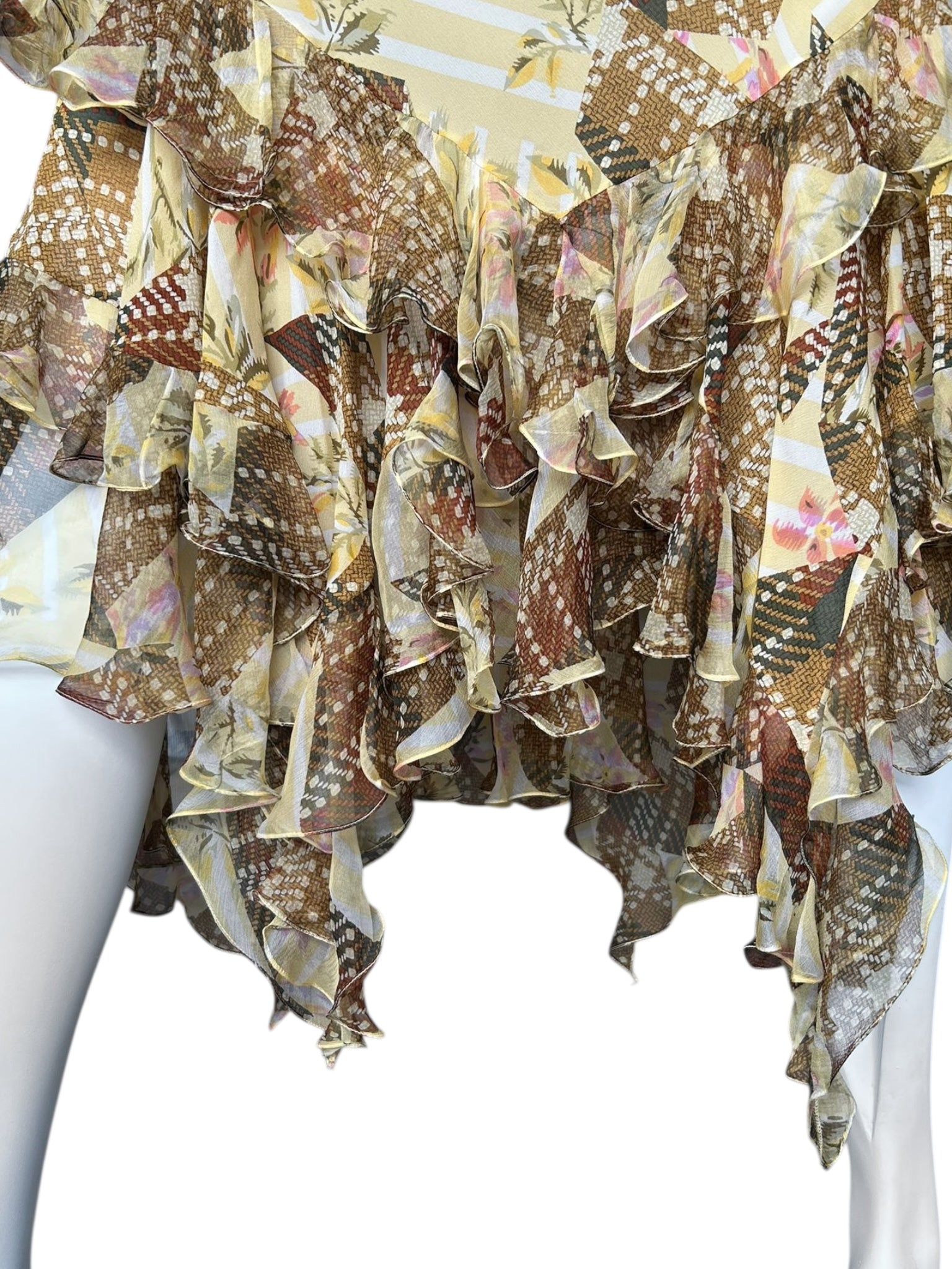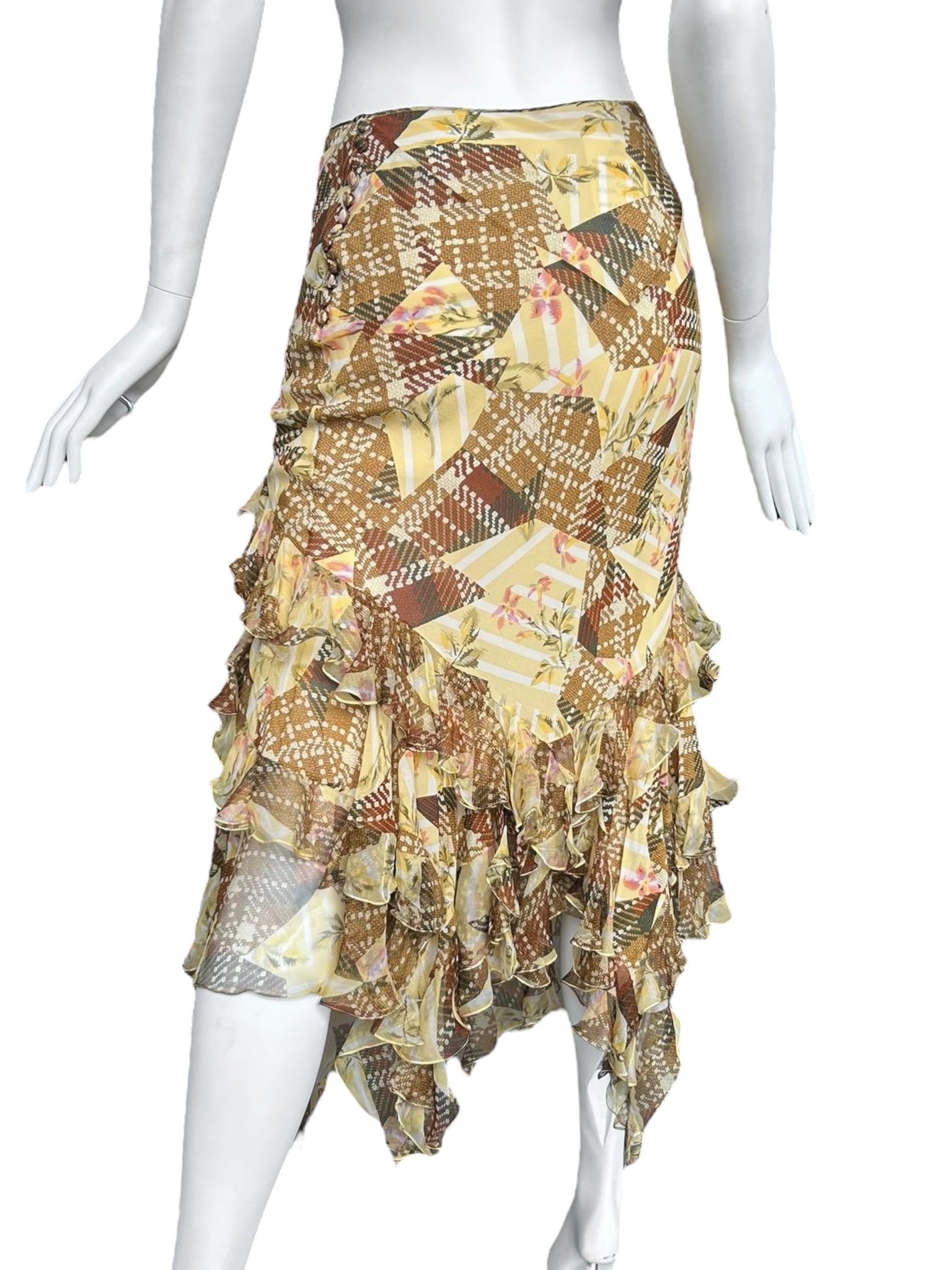 JOHN GALLIANO FW2004 YELLOW & BROWN TARTAN SILK RUFFLES MAXI SKIRT