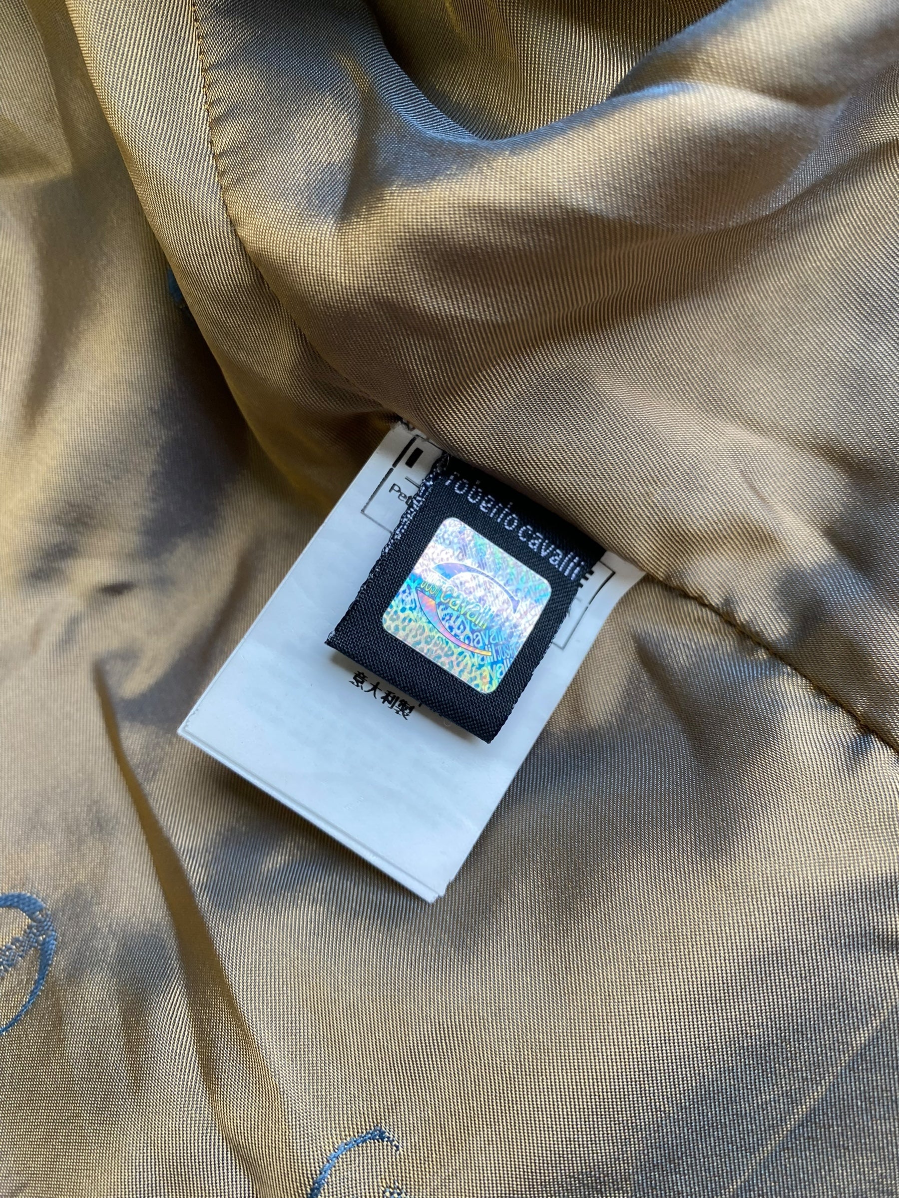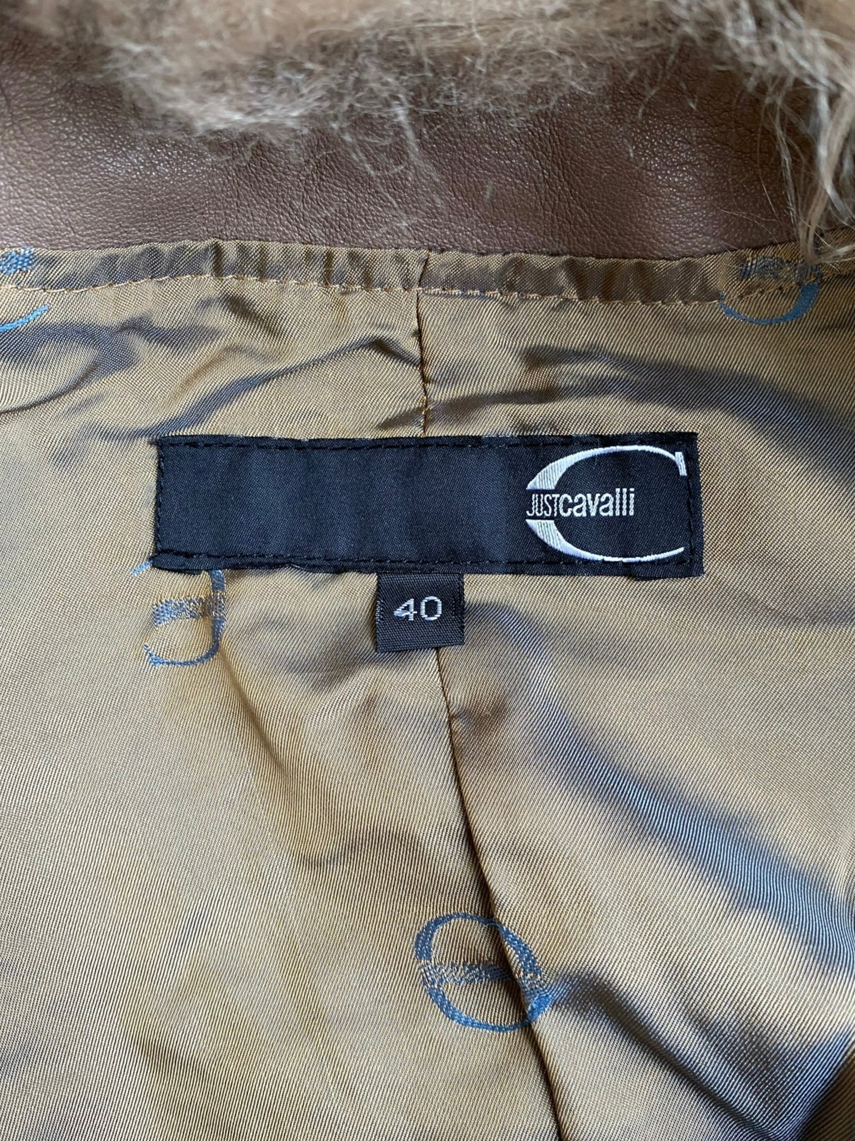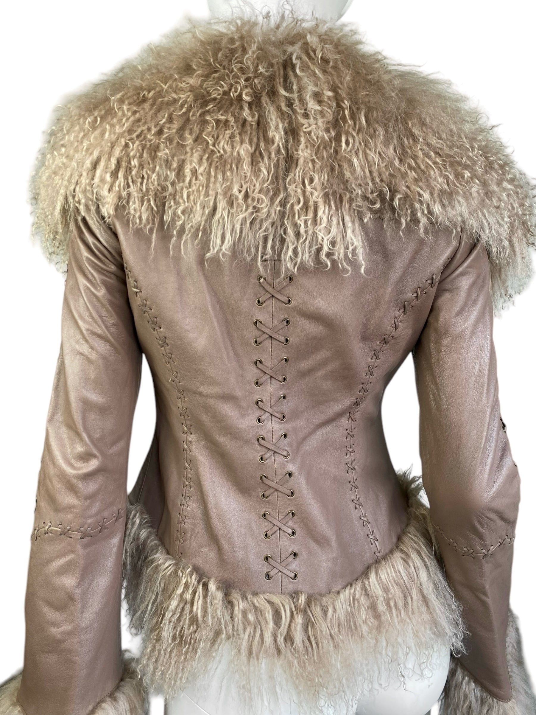 JUST CAVALLI 2000s BEIGE LEATHER LACED MONGOLIAN LAMB FUR TRIM JACKET