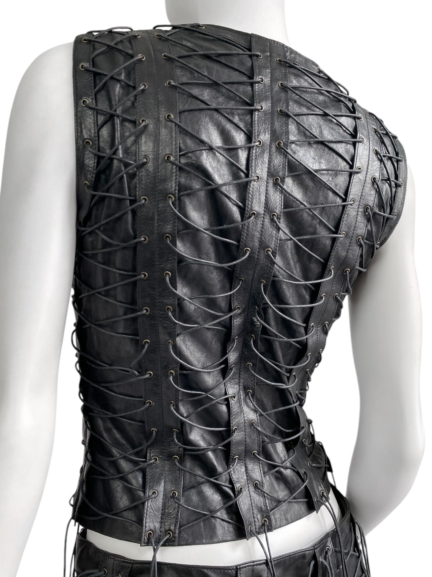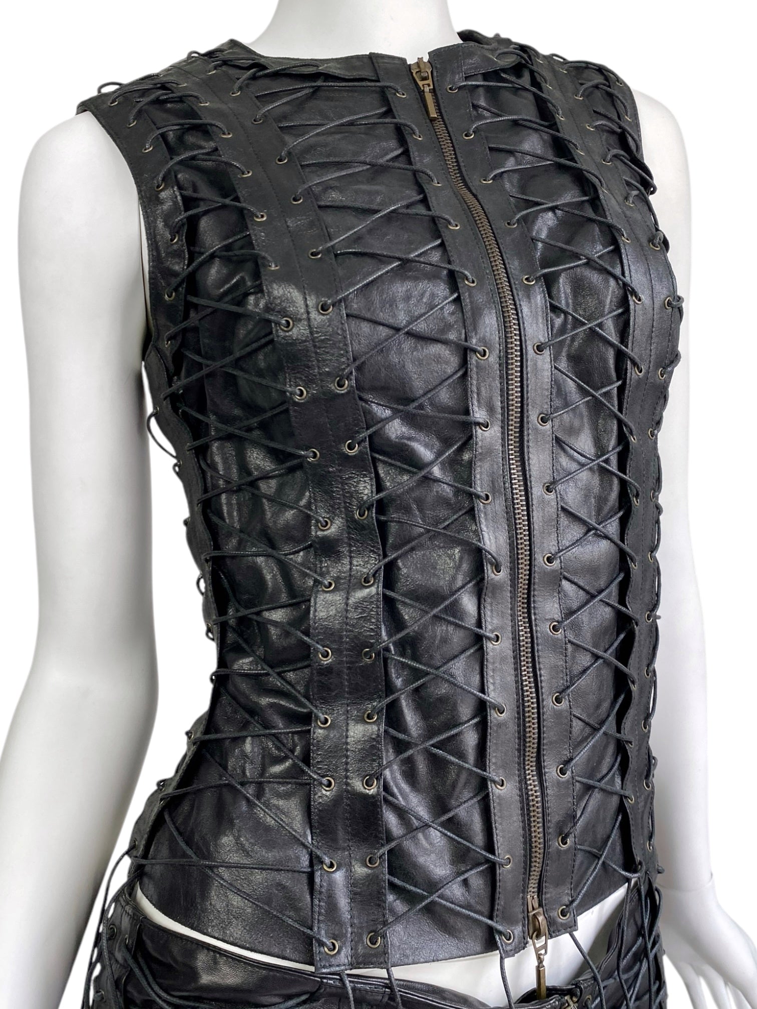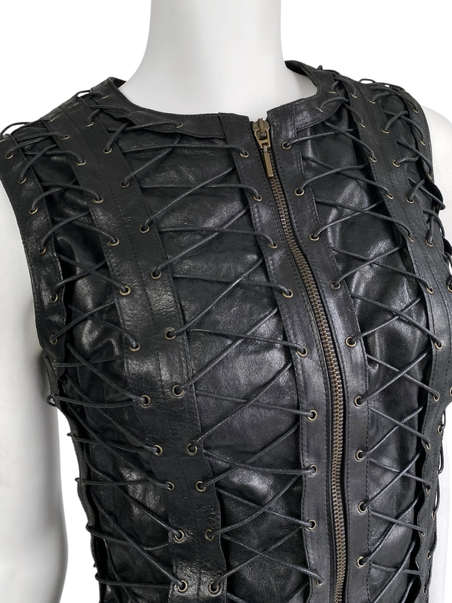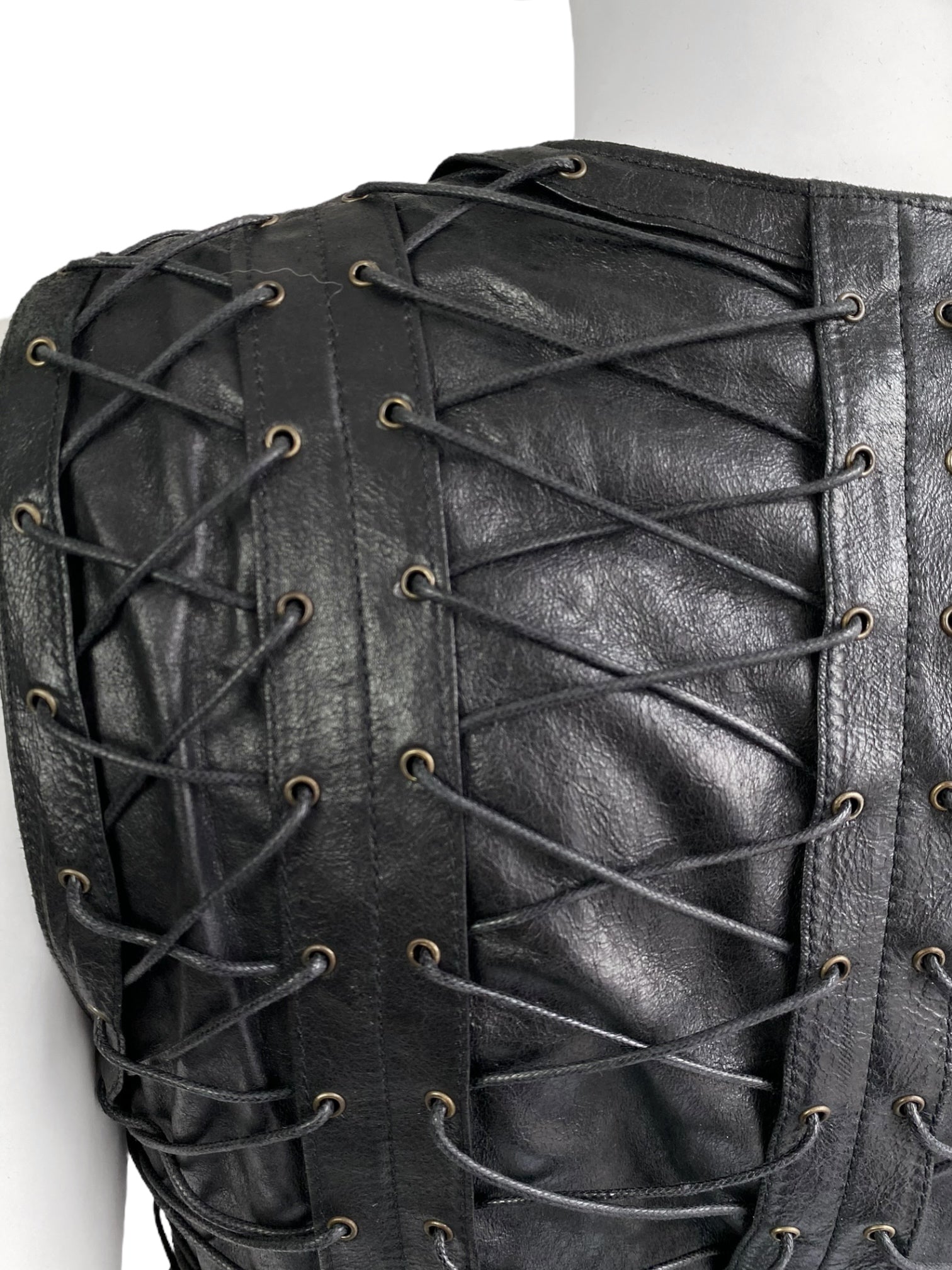 PLEIN SUD FW2002 BLACK LEATHER LACE-UP CAGE SLEEVELESS JACKET